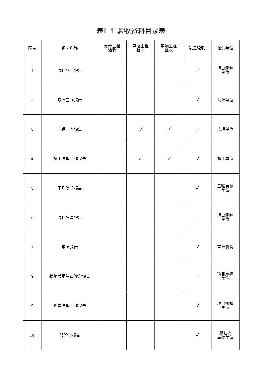 表格名称:表I.1 验收资料目录表