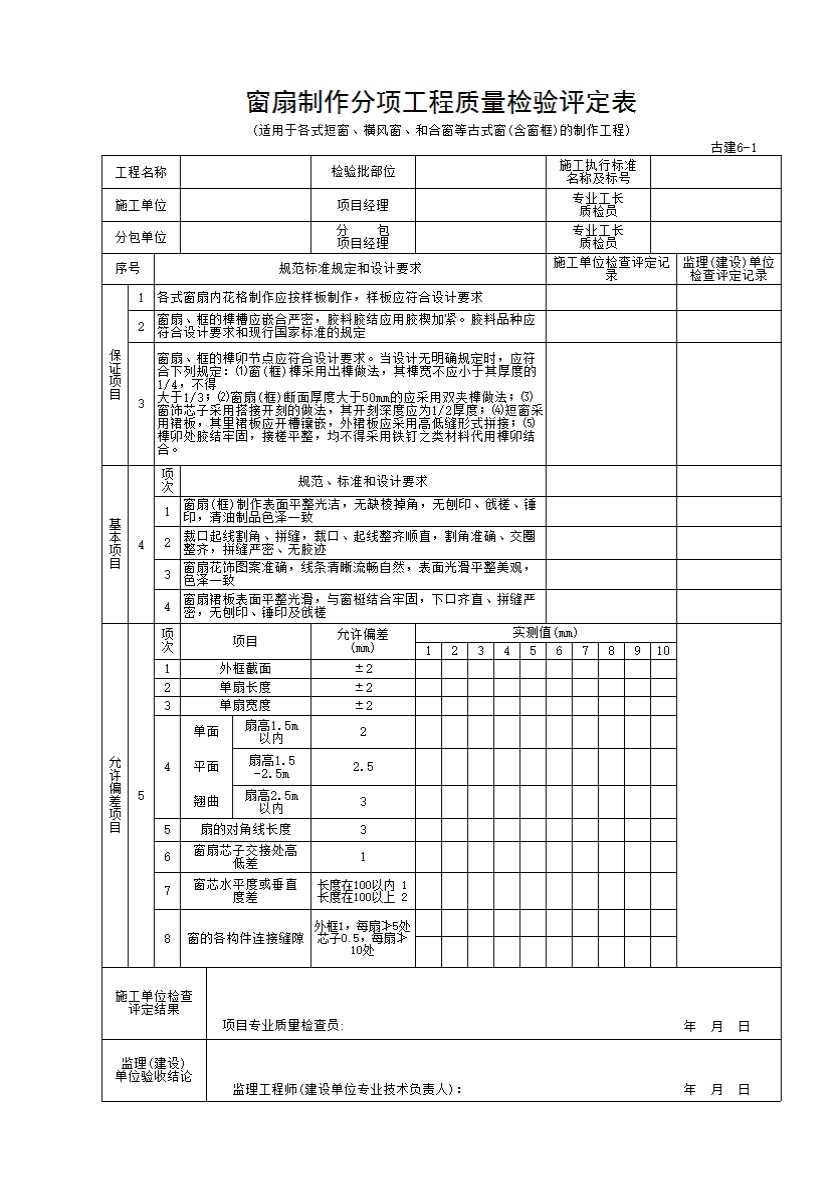 表格名称:古建6-1 窗扇制作分项工程质量检验评定表