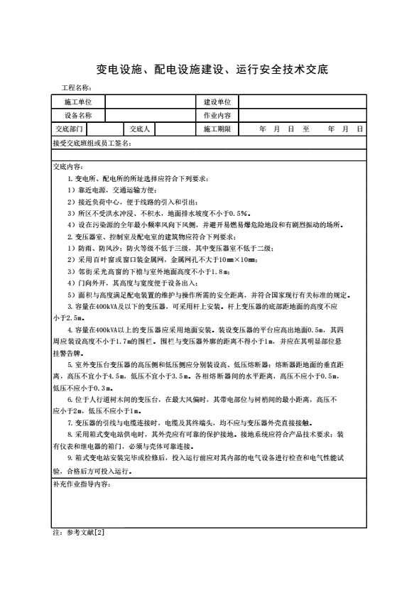 表格名称:变电设施、配电设施建设、运行安全技术交底