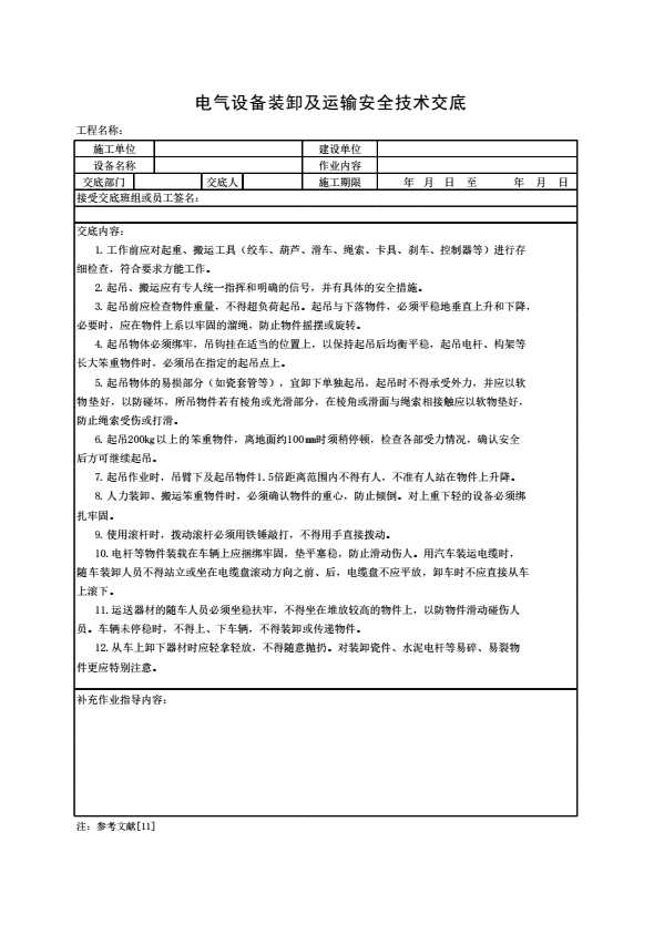 表格名称:电气设备装卸及运输安全技术交底