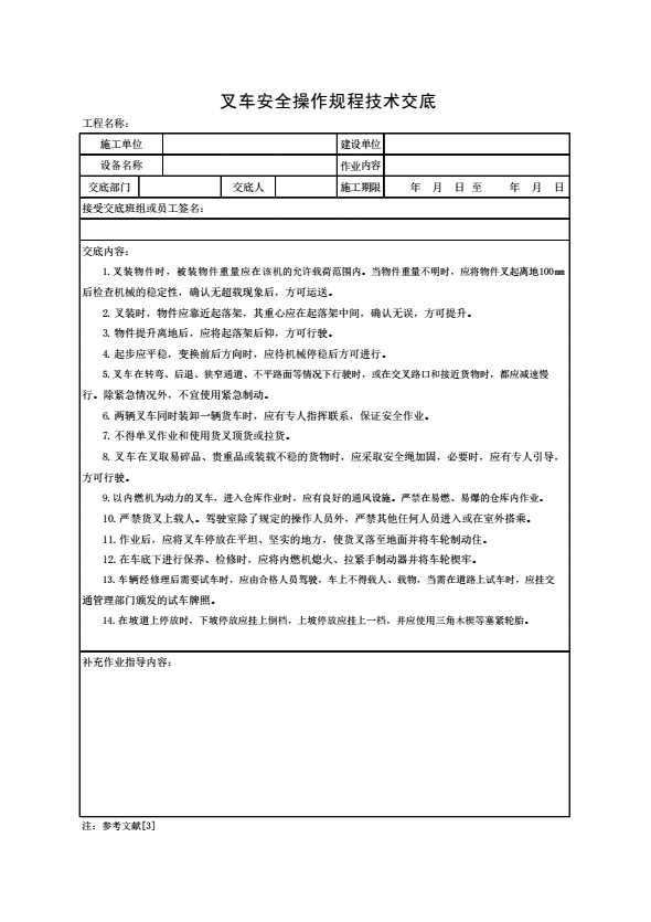 表格名称:叉车安全操作规程技术交底
