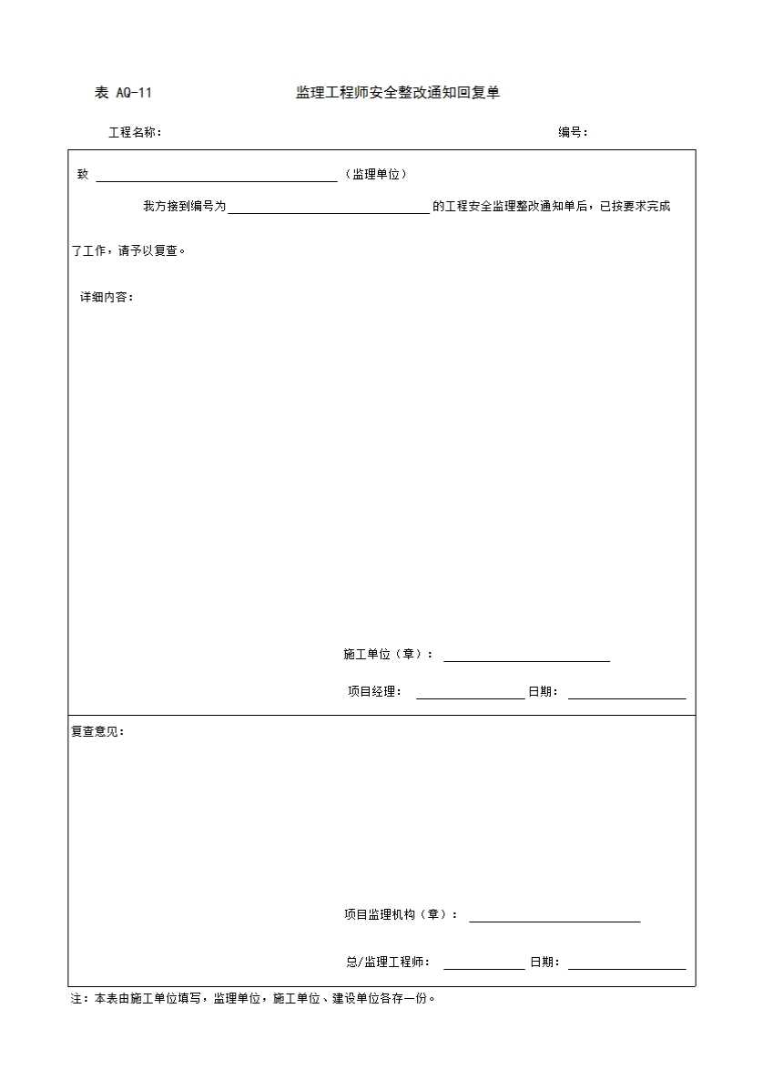 表格名称:表AQ-11 监理工程师安全整改通知回复单