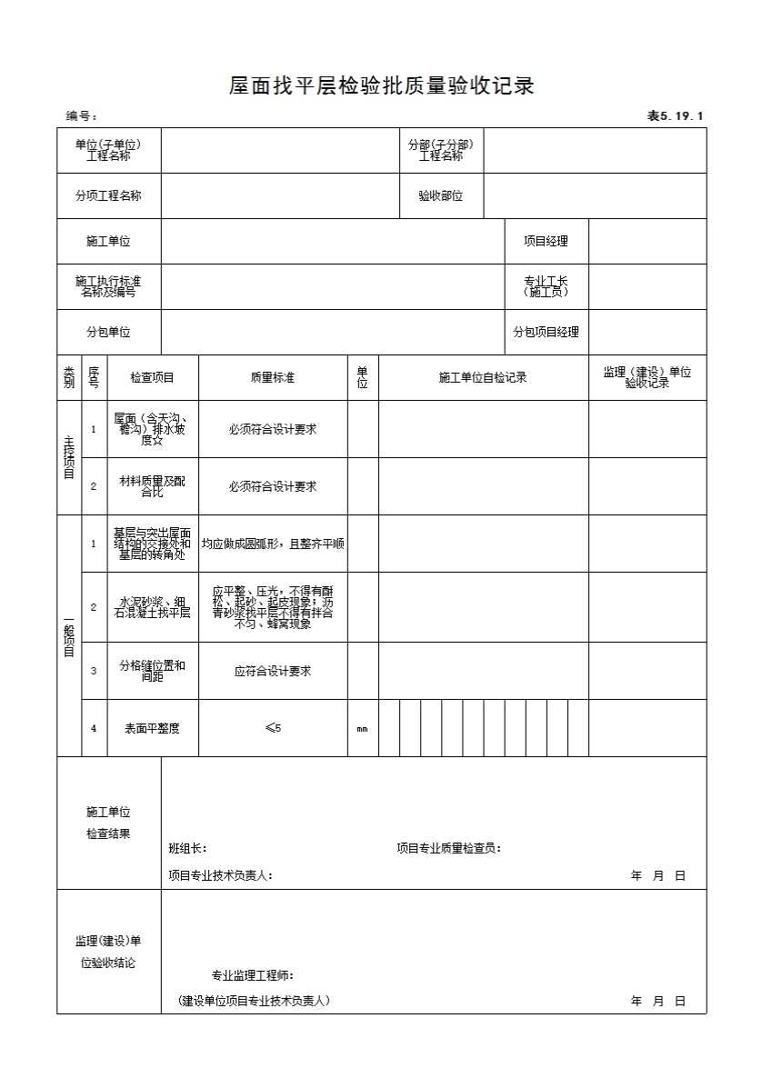 表格名称:5.19.1 屋面找平层检验批质量验收记录