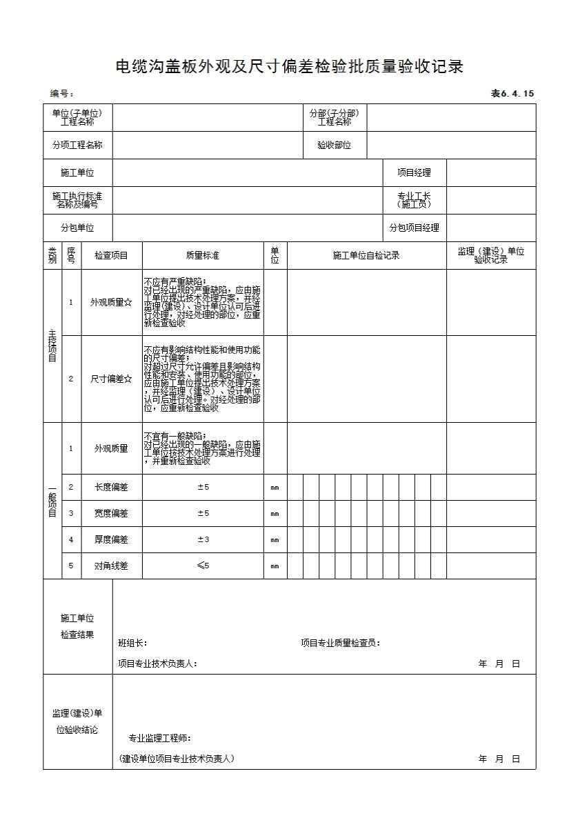 表格名称:6.4.15 电缆沟盖板外观及尺寸偏差检验批质量验收记录