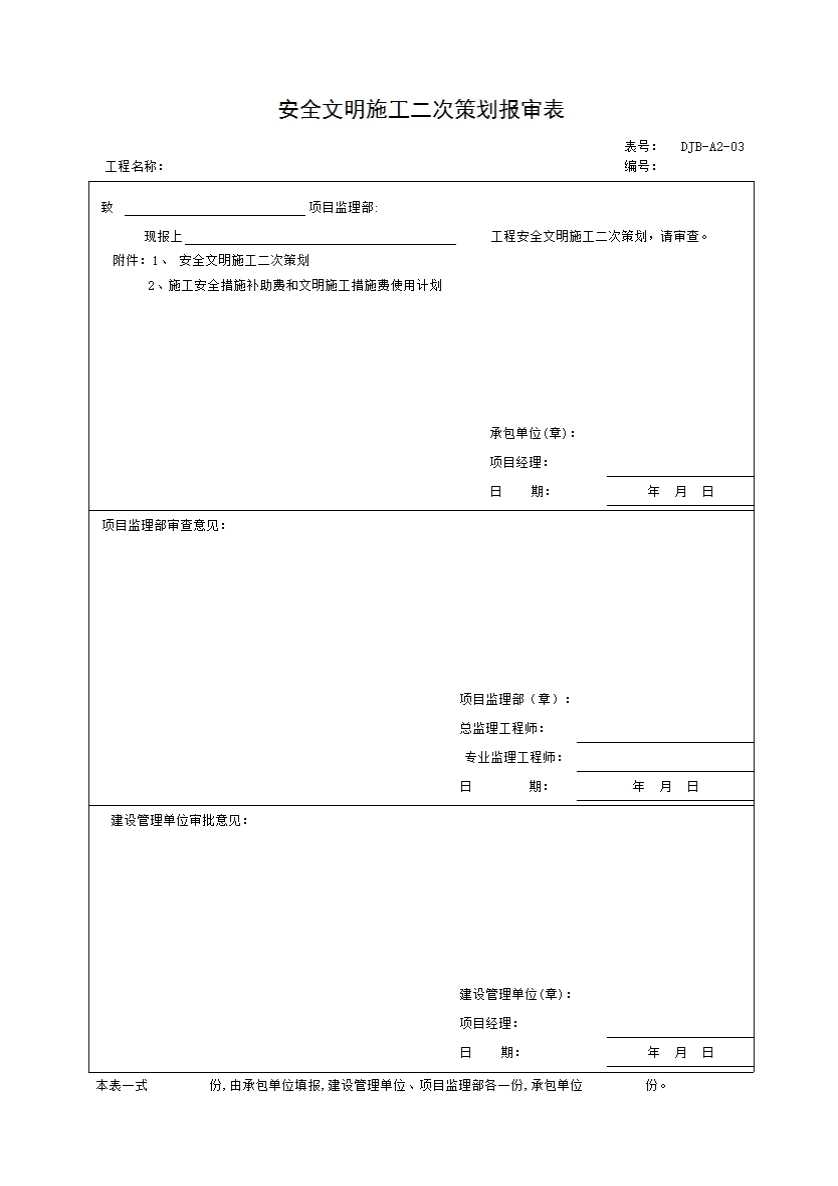 表格名称:DJB-A2-03 安全文明施工二次策划报审表