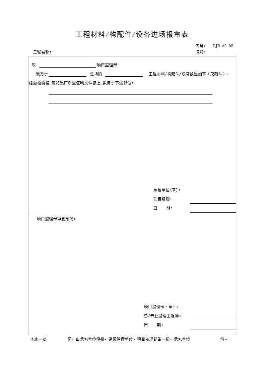 表格名称:DJB-A9-02 工程材料构配件设备进场报审表