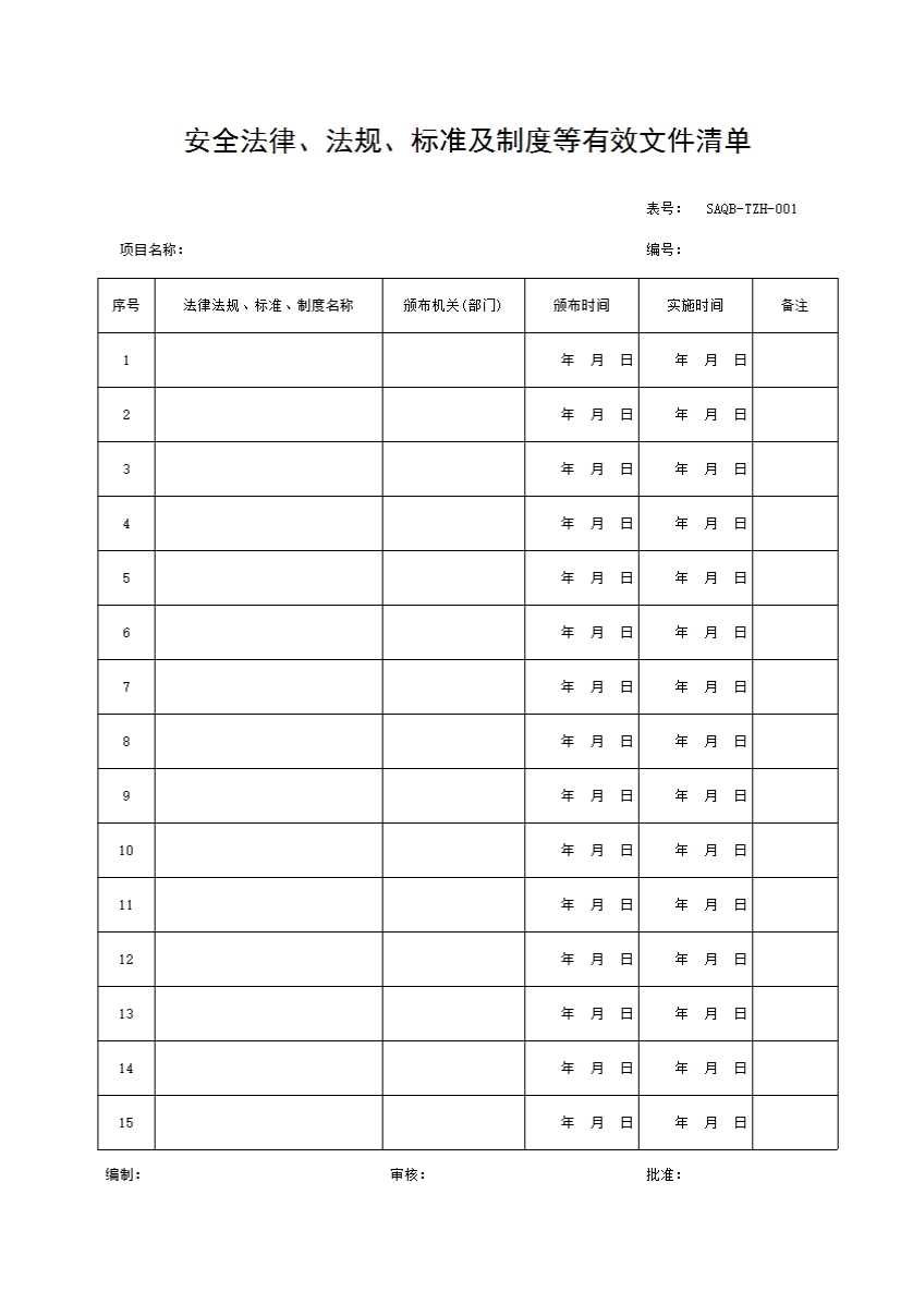 表格名称:安全法律、法规、标准及制度等有效文件清单