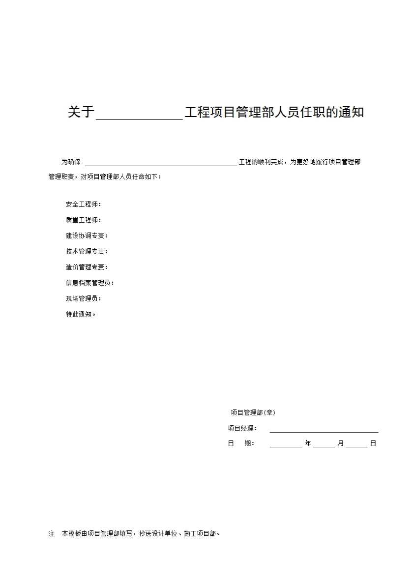 表格名称:XSZ1 关于成立____工程项目管理部及____任职的通知