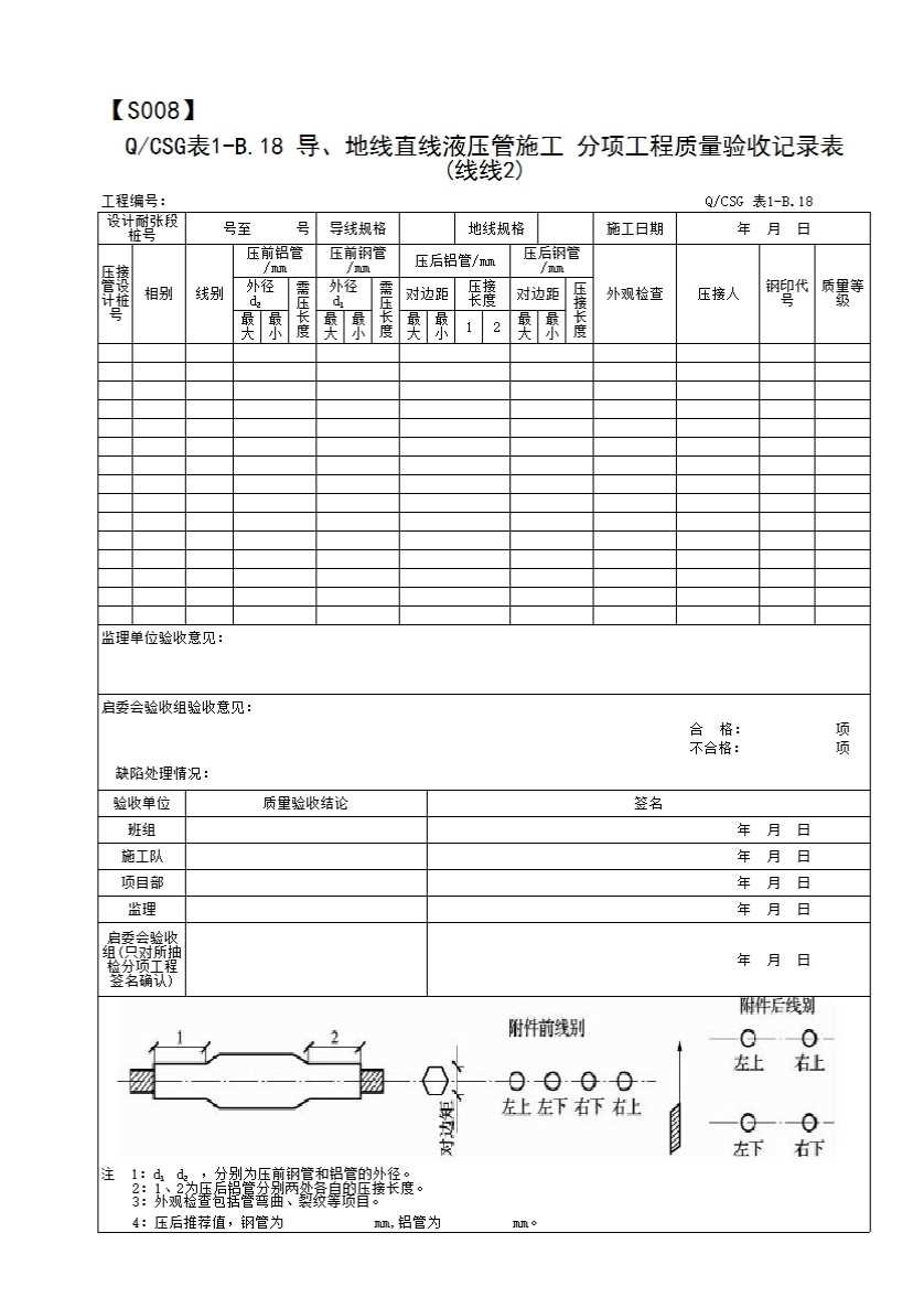 表格名称:QCSG 表 1-B.18 导、地线直线液压管施工 分项工程质量验收记录表(线线2)