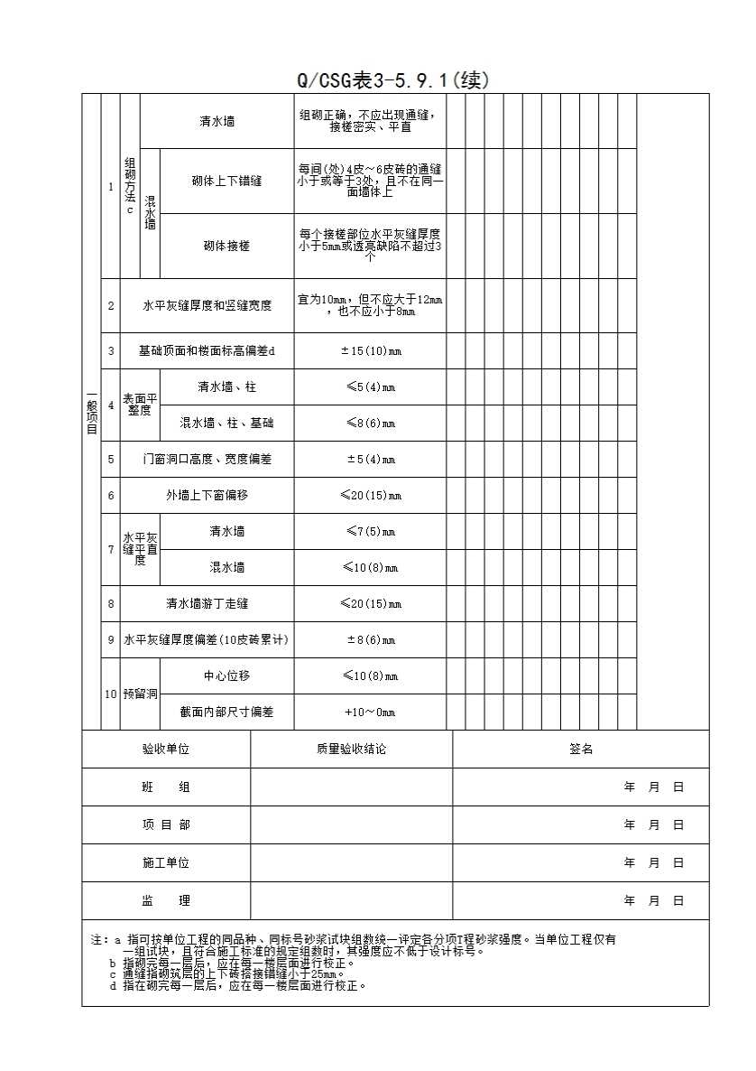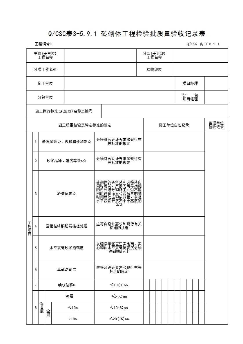 QCSG 表 3-5.9.1 砖砌体工程检验批质量验收记录表