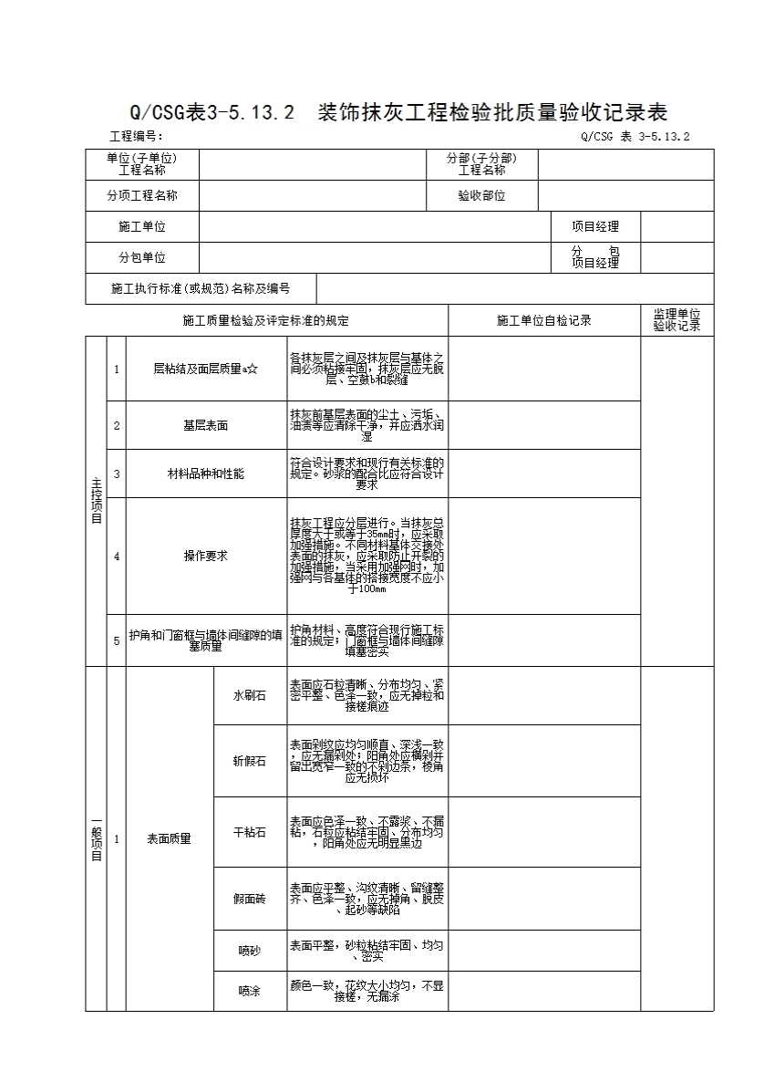 表格名称:QCSG 表 3-5.13.2 装饰抹灰工程检验批质量验收记录表