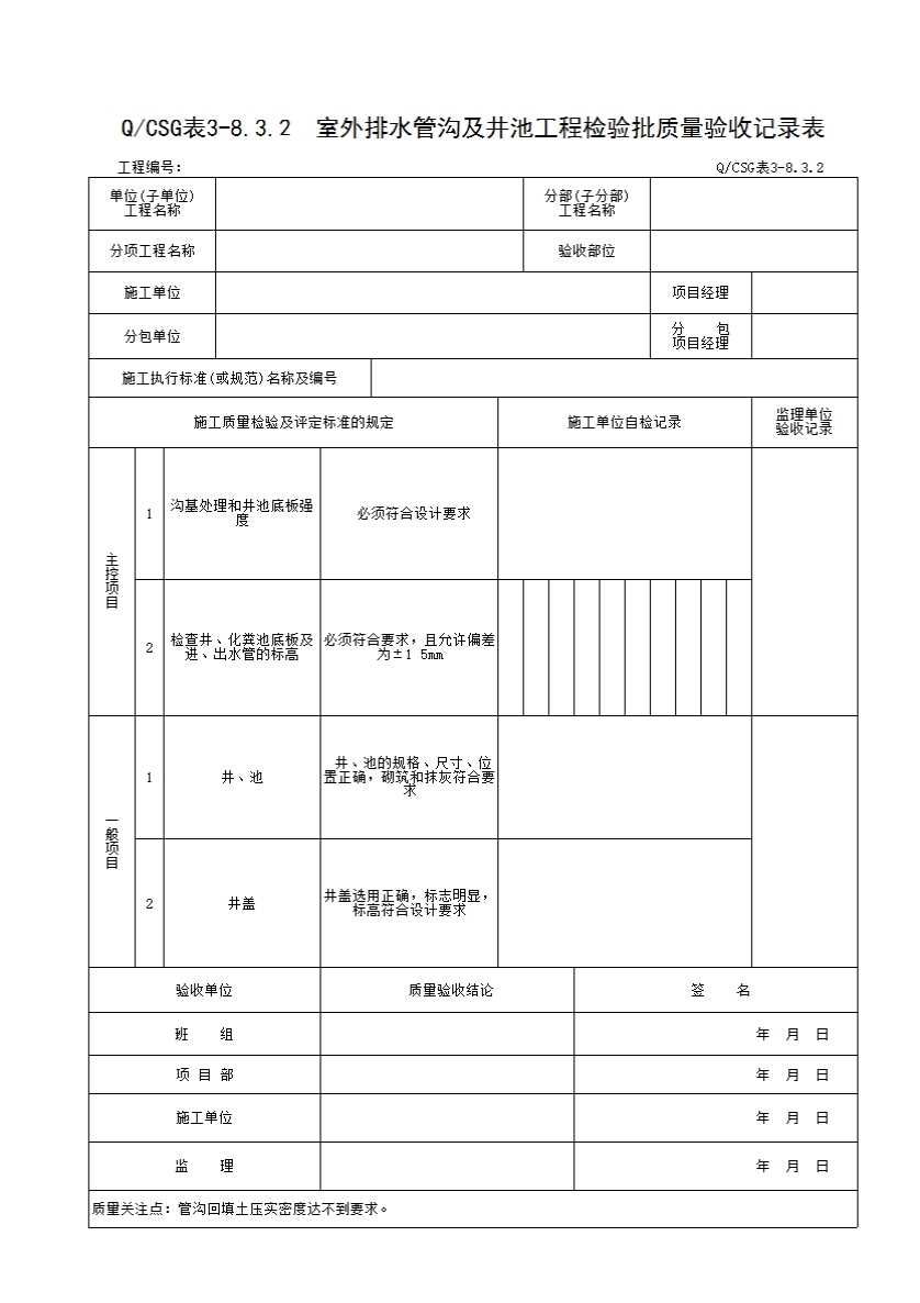 表格名称:QCSG 表 3-8.3.2 室外排水管沟及井池工程检验批质量验收记录表