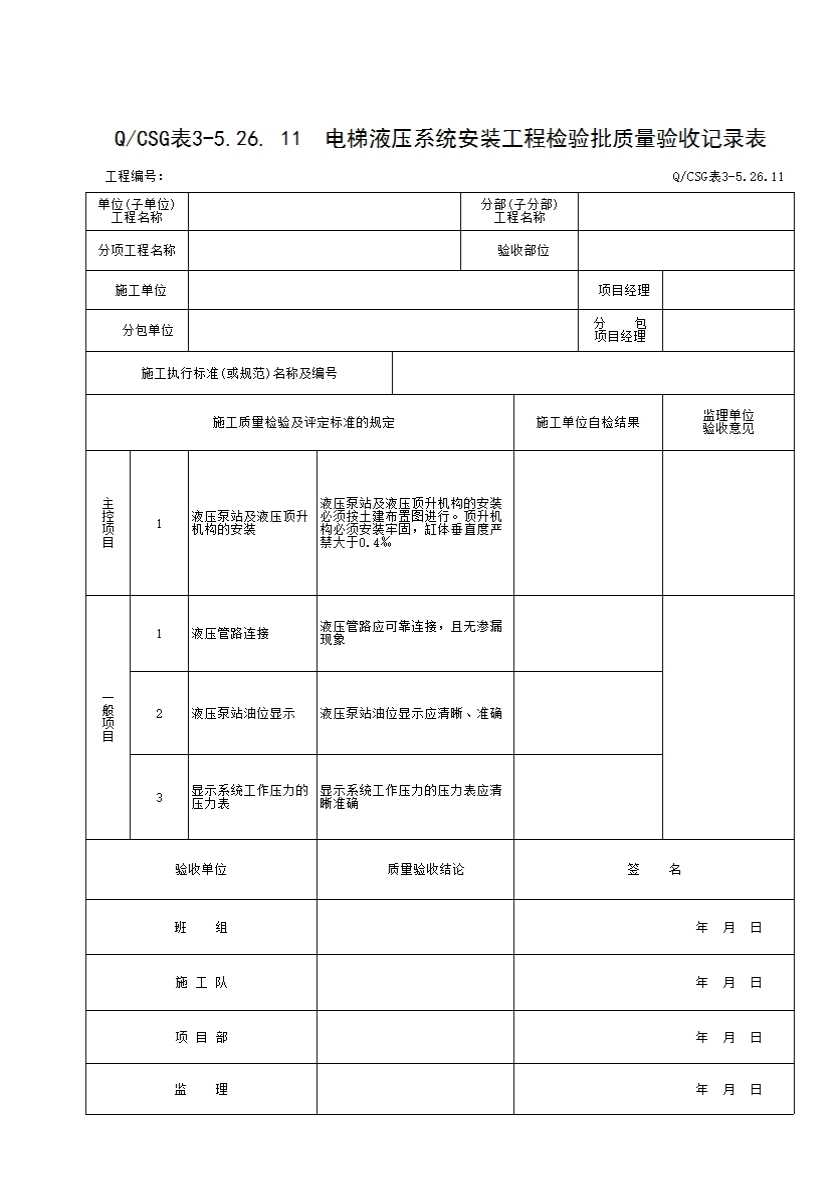QCSG 表 3-5.26.11 电梯液压系统安装工程检验批质量验收记录表