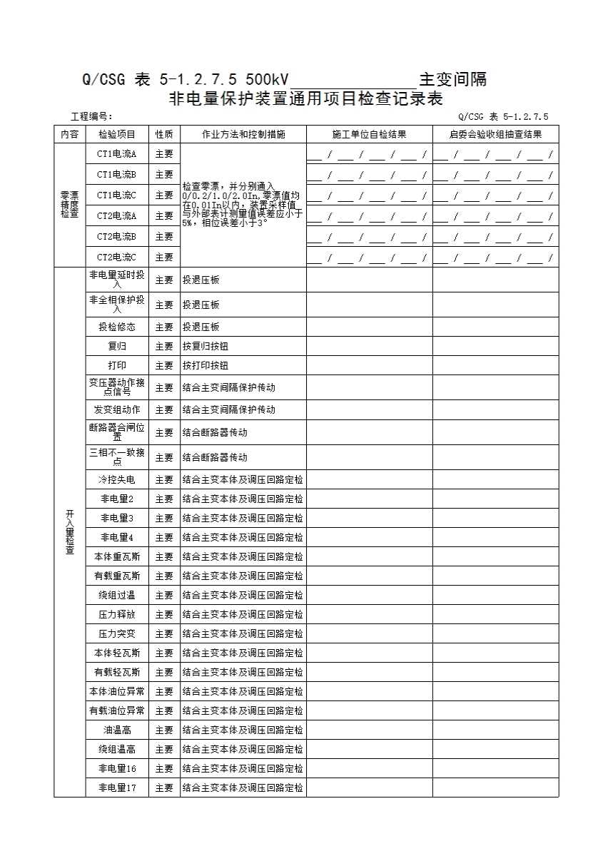 QCSG 表 5-1.2.7.5 500kV_____主变间隔 非电量保护装置通用项目检查记录表