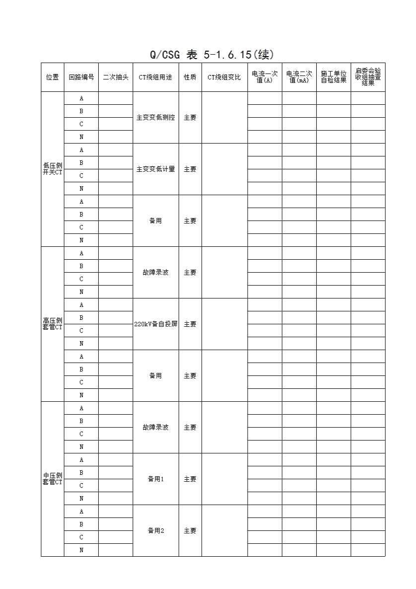 表格名称:QCSG 表 5-1.6.15 220kV_____主变间隔 互感器通流 分项工程质量验收记录表