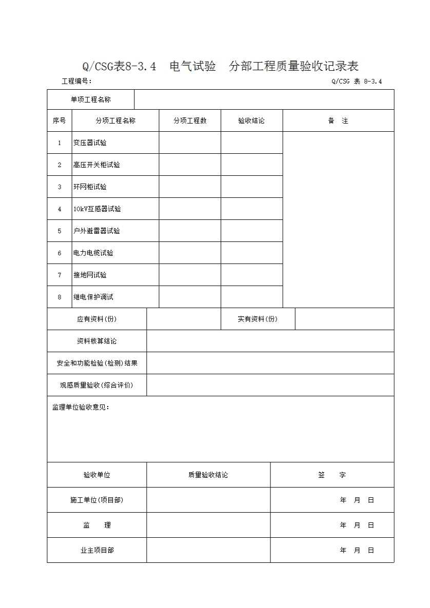 QCSG表8-3.4 电气试验 分部工程质量验收记录表