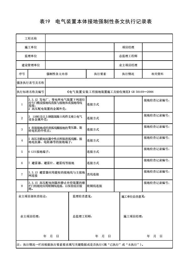 表格名称:表19 电气装置本体接地强制性条文执行记录表