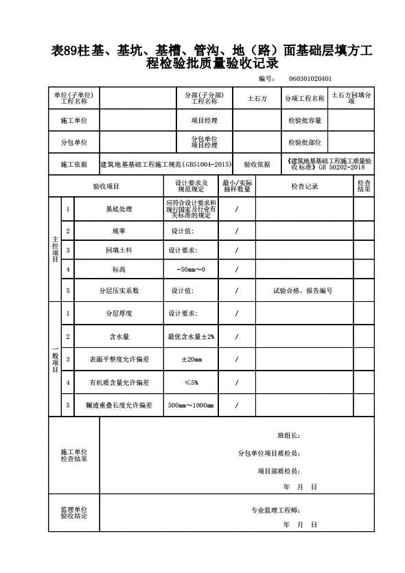 表格名称:060301020401 柱基、基坑、基槽、管沟、地(路)面基础层填方工程检验批质量验收记录