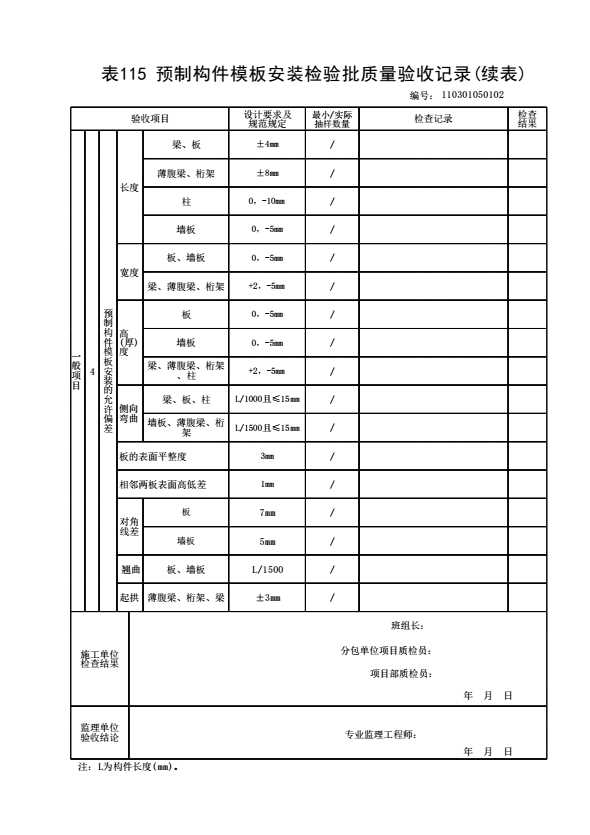 表格名称:110301050102 预制构件模板安装检验批质量验收记录