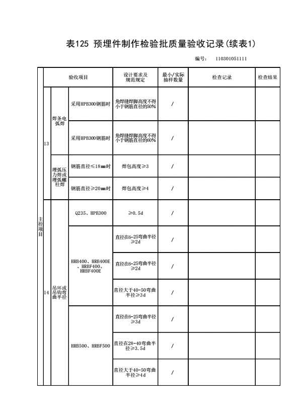 表格名称:110301051111 预埋件制作检验批质量验收记录