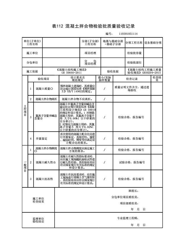 表格名称:110301051114 混凝土拌合物检验批质量验收记录