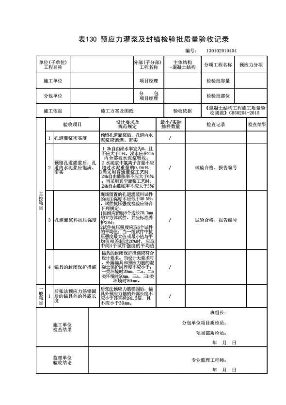 表格名称:130102010404 预应力灌浆及封锚检验批质量验收记录
