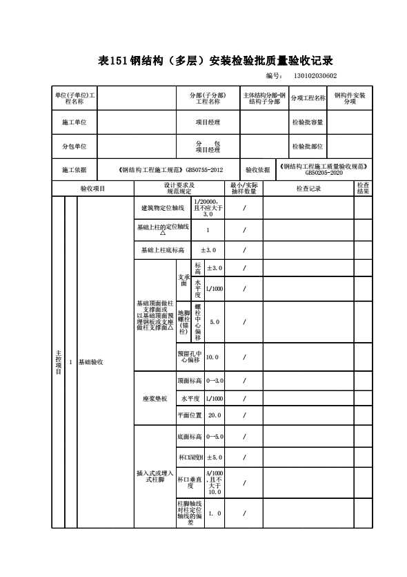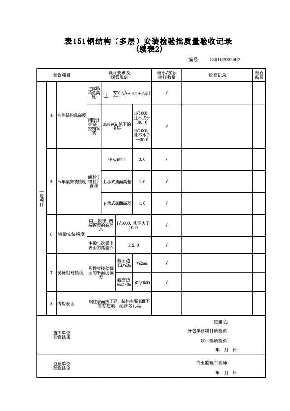 表格名称:130102030602 钢结构(多层)安装检验批质量验收记录