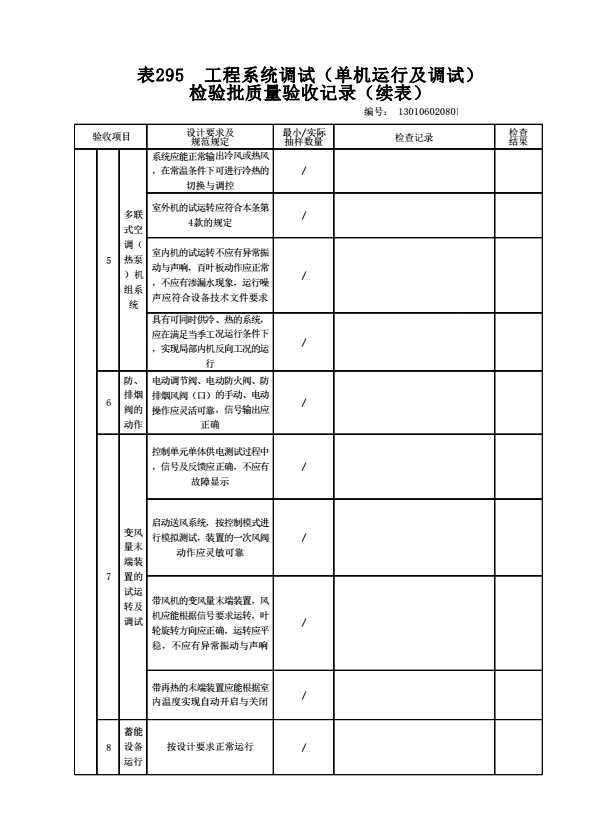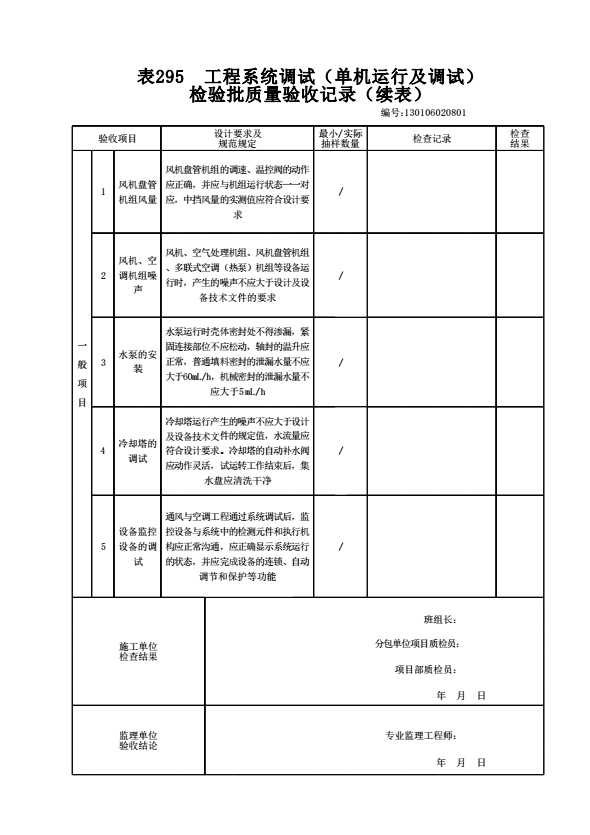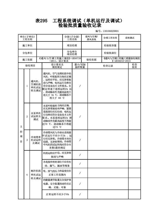 表格名称:130106020801 工程系统调试(单机运行及调试)检验批质量验收记录