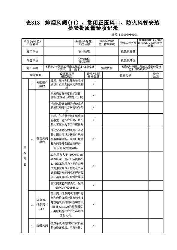 表格名称:130106030601 排烟风阀(口)、常闭正压风口、防火风管安装检验批质量验收记录
