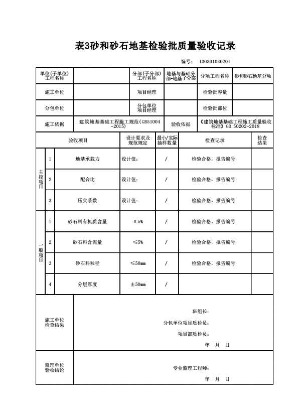 表格名称:130301030201 砂和砂石地基检验批质量验收记录