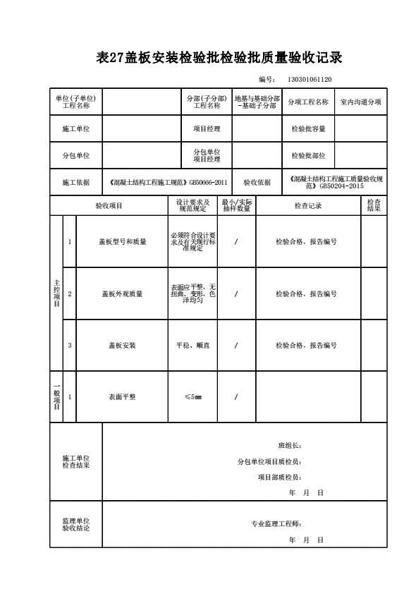 表格名称:130301061120 盖板安装检验批检验批质量验收记录
