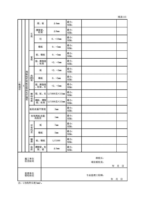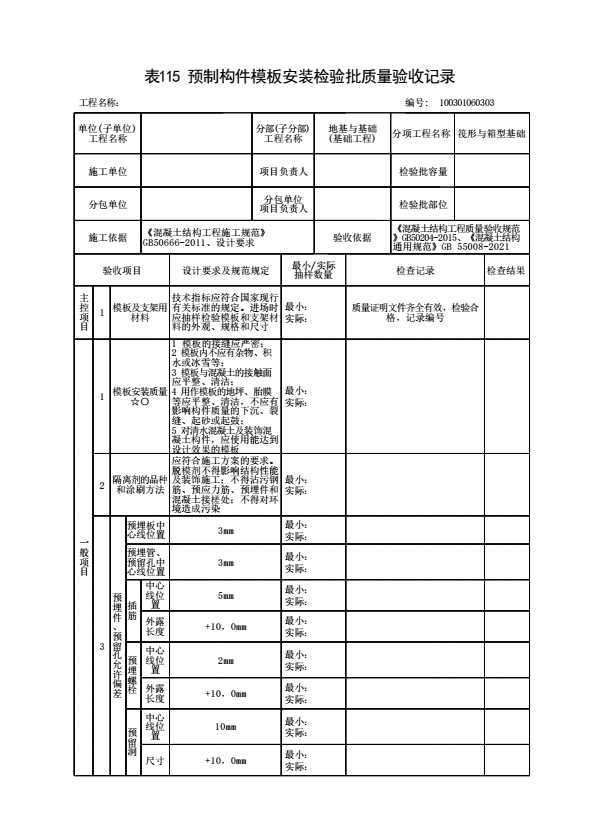 表格名称:100301060303 预制构件模板安装检验批质量验收记录
