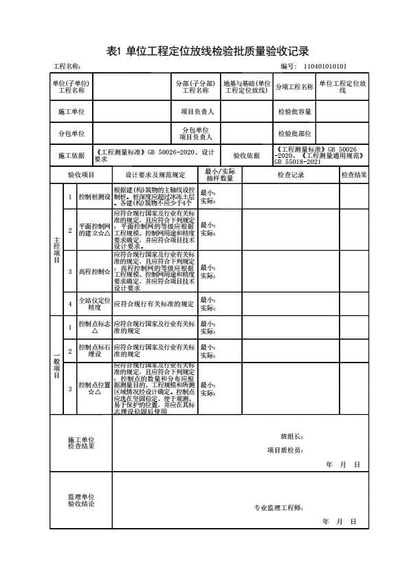 表格名称:110401010101 单位工程定位放线检验批质量验收记录