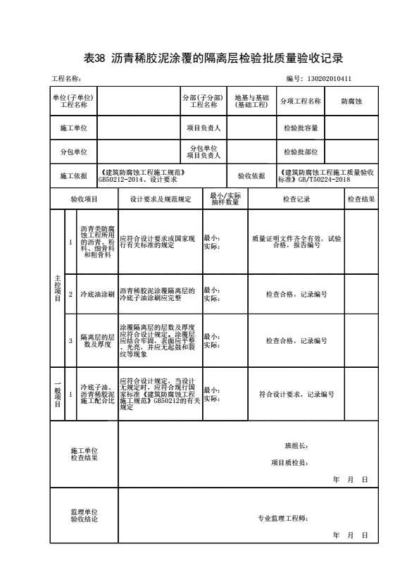 表格名称:130202010411 沥青稀胶泥涂覆的隔离层检验批质量验收记录