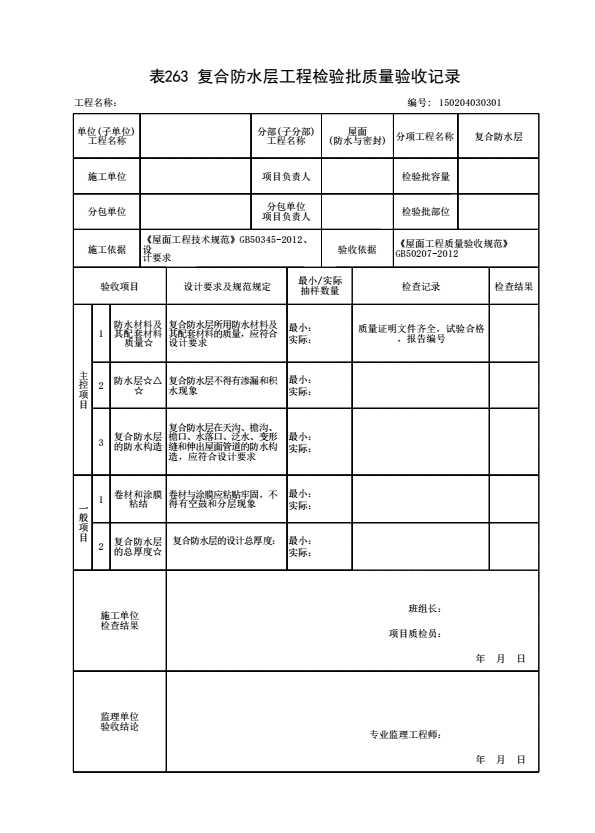 表格名称:150204030301 复合防水层工程检验批质量验收记录