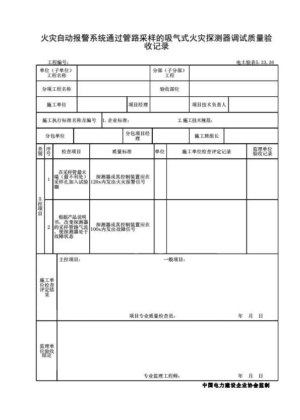 表格名称:电土验表5.33.36 火灾自动报警系统通过管路采样的吸气式火灾探测器调试质量验收记录
