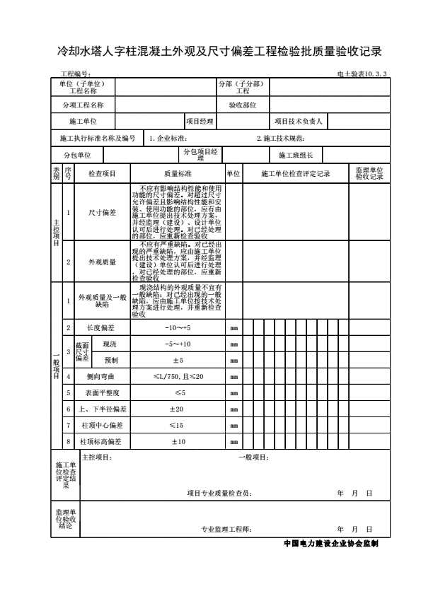 表格名称:电土验表10.3.3 冷却水塔人字柱混凝土外观及尺寸偏差工程检验批质量验收记录
