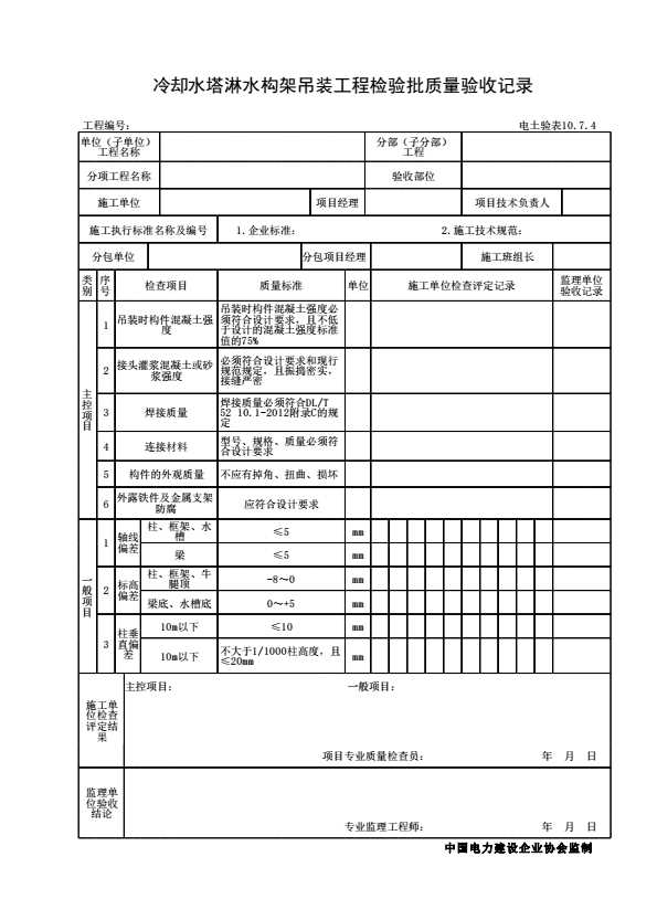 表格名称:电土验表10.7.4 冷却水塔淋水构架吊装工程检验批质量验收记录
