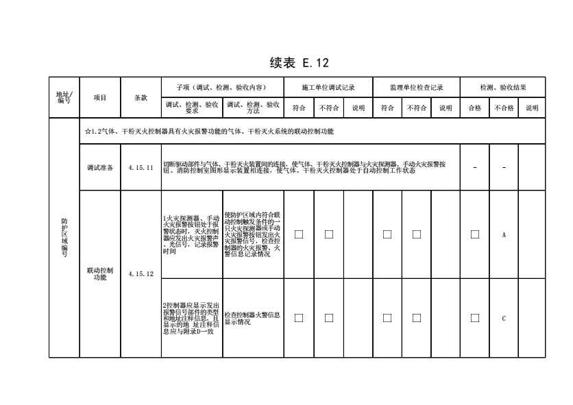 表格名称:表E.12 气体、干粉灭火系统调试、检测、验收记录(续表34)