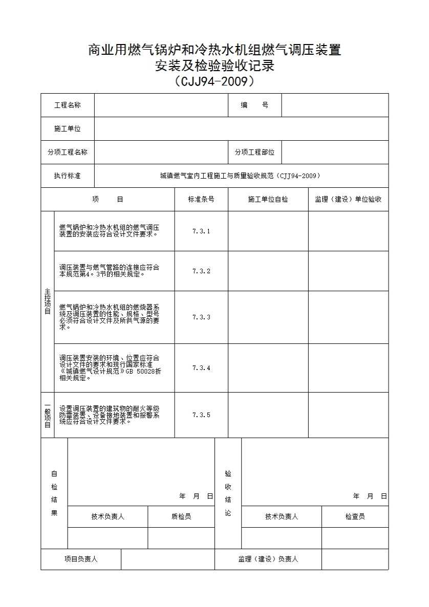 表格名称:商业用燃气锅炉和冷热水机组燃气调压装置安装及检验验收记录