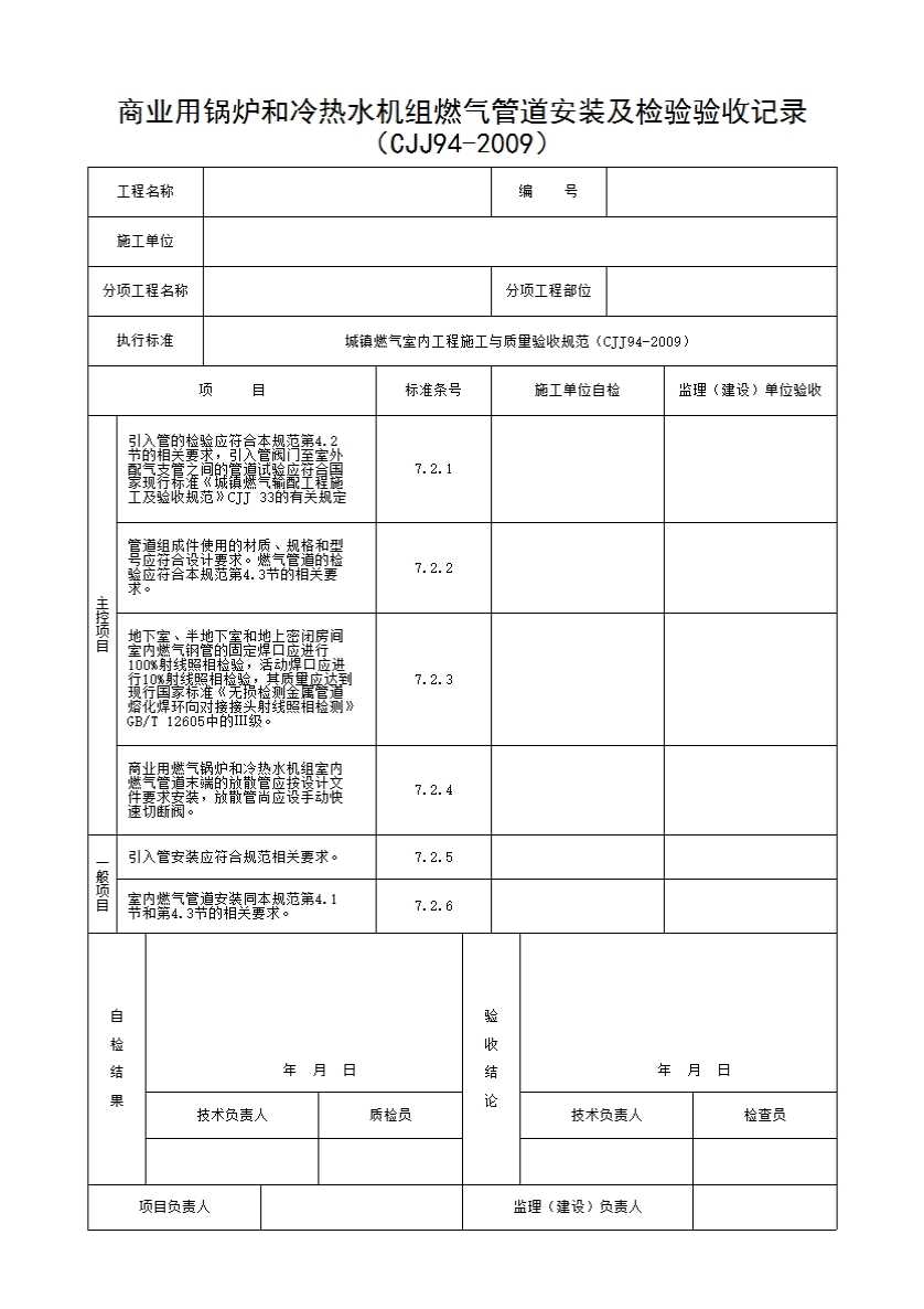 表格名称:商业用锅炉和冷热水机组燃气管道安装及检验验收记录