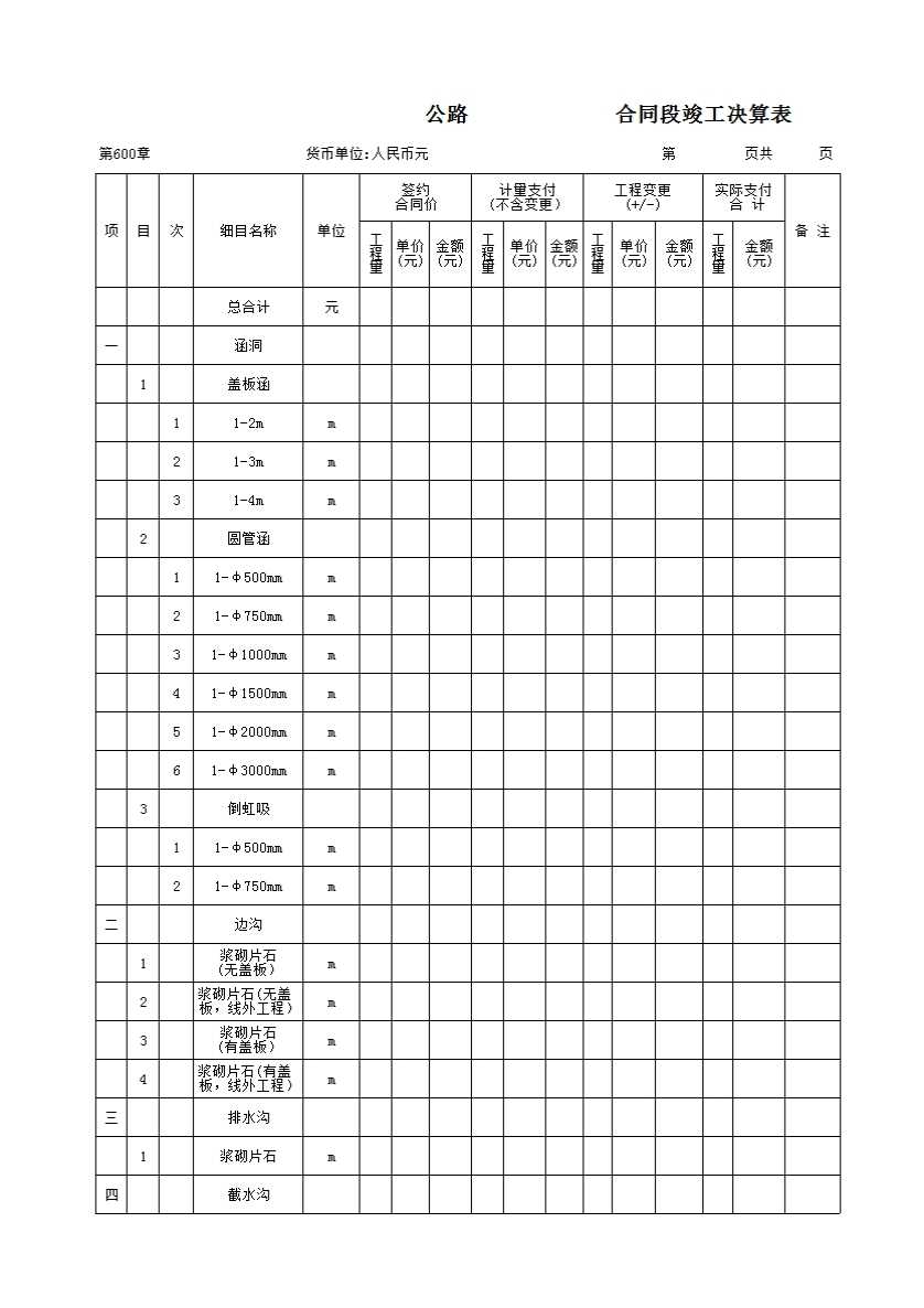 表格名称:________公路_______合同段竣工决算表6