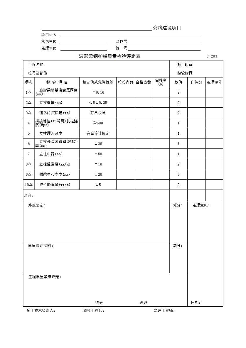 C-203 波形梁钢护栏质量检验评定表