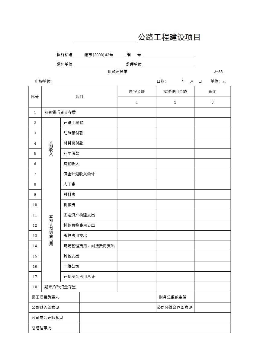 表格名称:A-68表 用款计划单