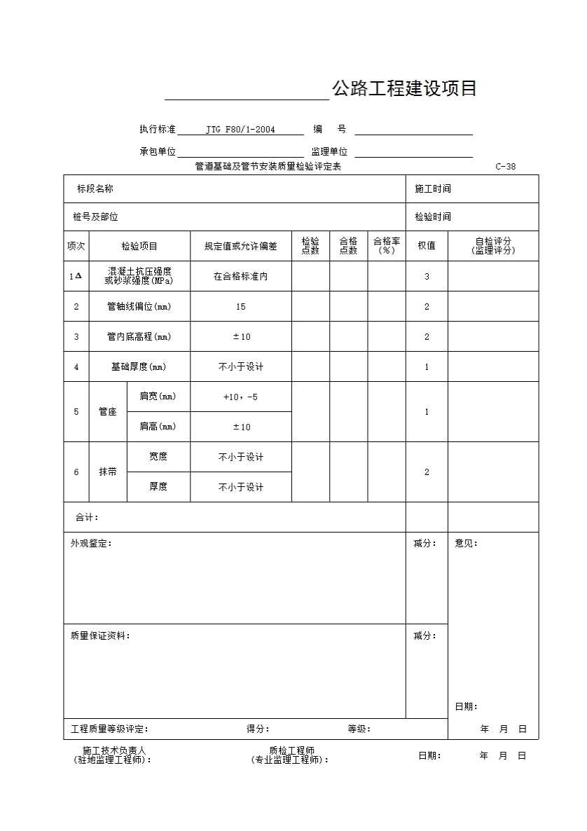 表格名称:C-38表 管道基础及管节安装质量检验评定表