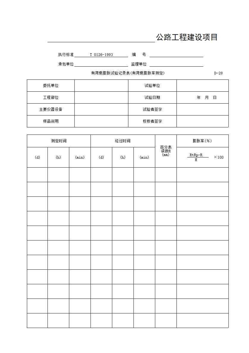 表格名称:D-28 有荷载膨胀试验记录表(有荷载膨胀率测定)