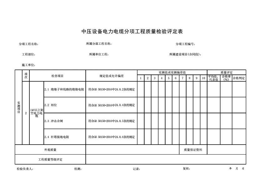 表9.19.2 中压设备电力电缆分项工程质量检验评定表