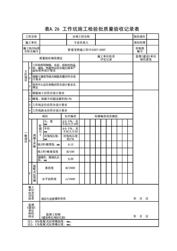 表格名称:表A.26 工作坑施工检验批质量验收记录表