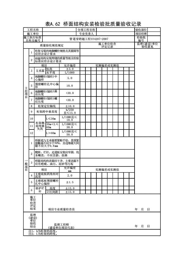 表格名称:表A.62 桥面结构安装检验批质量验收记录