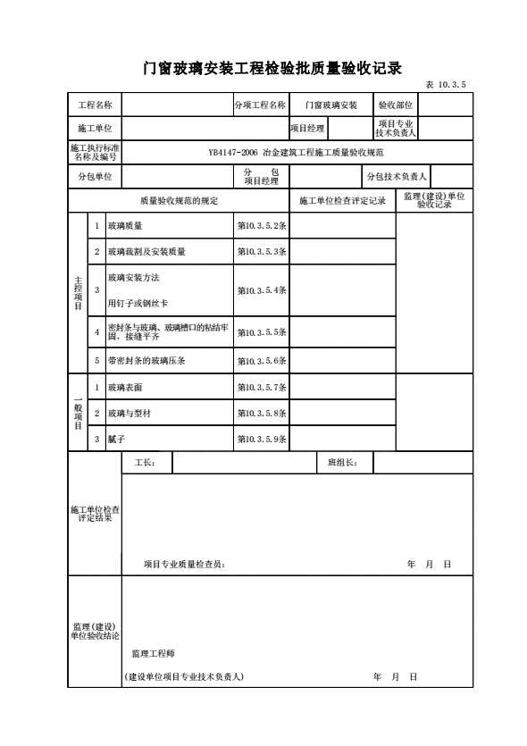表格名称:表10.3.5 门窗玻璃安装工程检验批质量验收记录